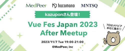 MedPeerの開発をしている栗崎 (Ryohei Kurisaki (@0ryo0ryo) / X )です。 11月7日(火)に弊社オフィスにて、MNTSQ株式会社、株式会社hacomonoと3社合同でVue Fes Japan 2023 After Meetup を開催しました。 5年ぶりのオフライン開催となった Vue Fes Japan 2…