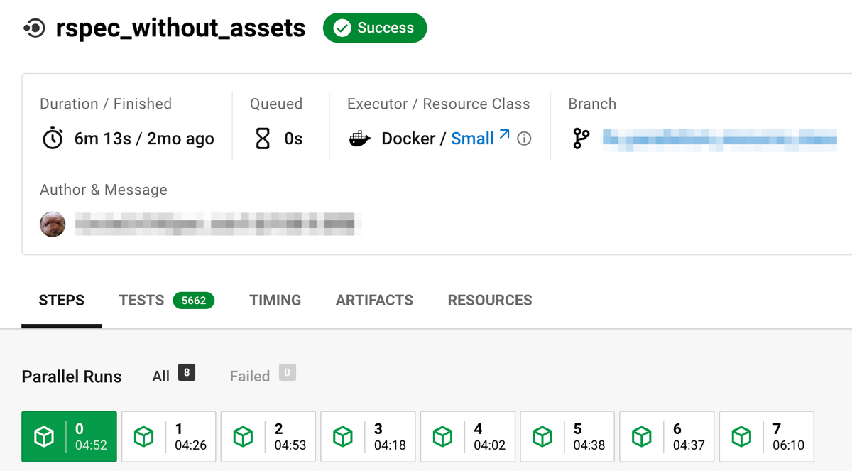 まず前提知識として、CircleCIには特定のJobを並列稼働させる仕組みがあります。 例えば以下はRSpec実行Jobを8並列で稼働している様子です。