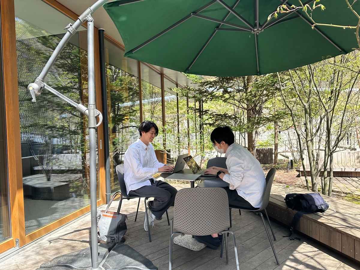 私は3人1チームとして参加していたので、ゴール設定や作業分担について話し合い、それから作業を開始しました。 直前の天気予報では小雨だったのですが、快晴だったのでテラスで会議しています。 BEB5は自然で覆われており、テラス席では小鳥のさえずりを聞きながら作業できます!